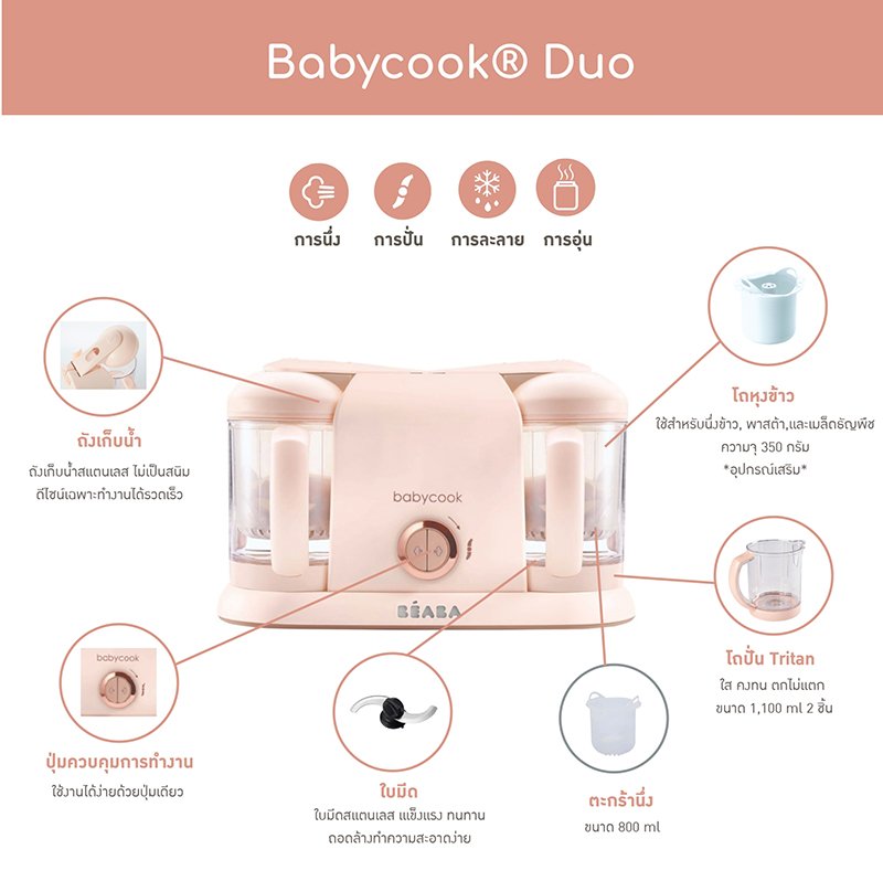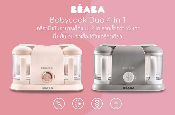 Babycook Duo 4 in 1 เครื่องนึ่งปั่นอาหารเด็ก แบบ 2 โถ ที่จะช่วยให้คุณแม่ทำอาหารให้ลูกน้อยได้เร็วกว่าและมากกว่าเดิม x2 เท่า โดยสามารถทำอาหารได้ 2 อย่างไปพร้อมๆ กัน ด้วยโถขนาดด้านละ 1,100 มล. จึงช่วยให้คุณแม่ทำอาหารได้มากกว่าที่เคย