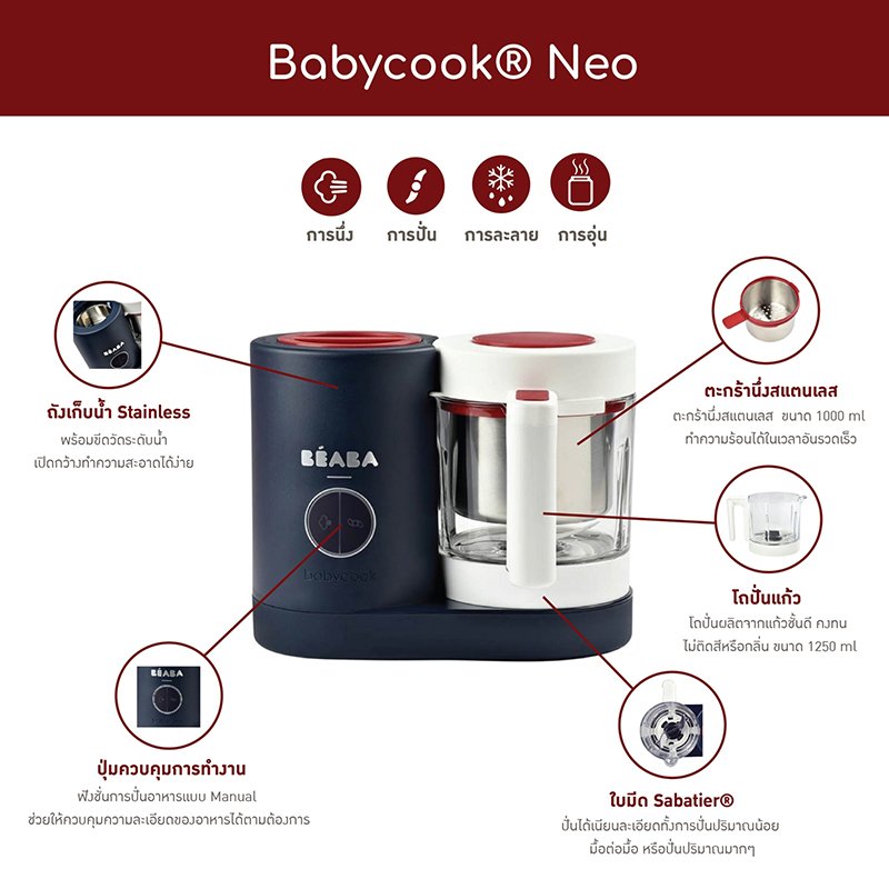 Babycook® Neo 4 in 1 เครื่องนึ่งปั่นอาหารเด็กตัวท็อป ผู้ช่วยมือหนึ่งที่คุณแม่ขาดไม่ได้! ตัวช่วยที่จะให้คุณแม่สามารถทำอาหารสดใหม่หลากหลายเมนูให้ลูกน้อยได้ง่ายๆ ในเวลาเพียง 15 นาที พร้อมด้วยฟังก์ชั่นที่หลากหลาย