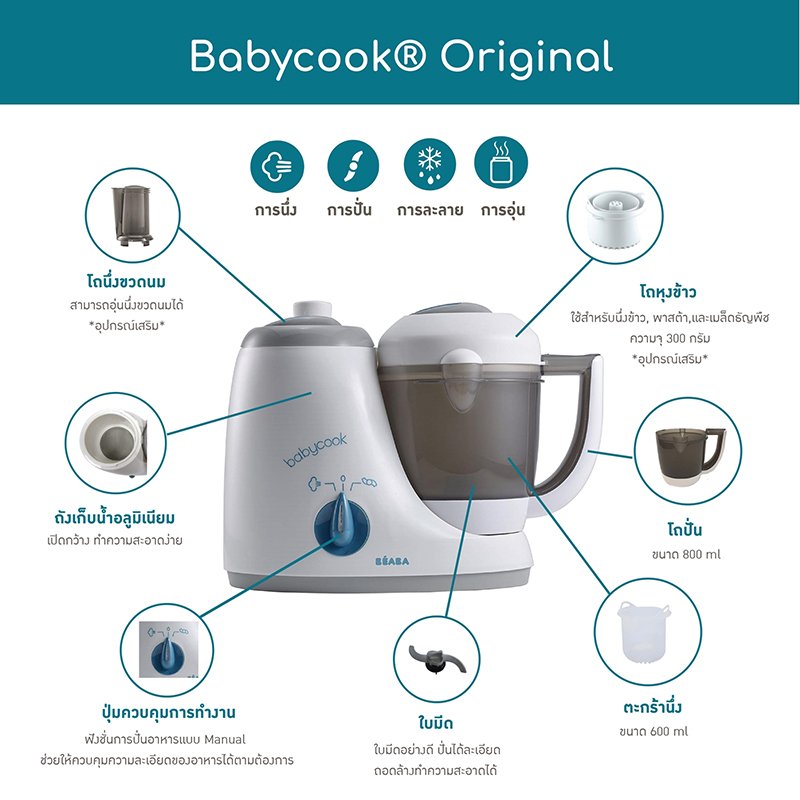 เครื่องนึ่งปั่นอาหารเด็ก Babycook Original น้องเล็กสุดของแบรนด์ Babycook เป็นเครื่องนึ่งปั่นอาหารเด็กรุ่นแรกๆ ของ Beaba ที่ได้รับการออกแบบมาเพื่อตอบโจทย์ความต้องการของคุณแม่ในการเตรียมอาหารให้กับลูกน้อย ด้วยคุณสมบัติเด่นที่สามารถ นึ่ง ปั่น อุ่น ละลายน้ำแข็ง ได้ในเครื่องเดียวภายในเวลาเพียง 15 นาที มาพร้อมระบบนึ่งไอน้ำ Patent ที่เป็นเอกลักษณ์เฉพาะของ Beaba ที่สามารถกระจายความร้อนได้อย่างทั่วถึงและให้อุณหภูมิคงที่