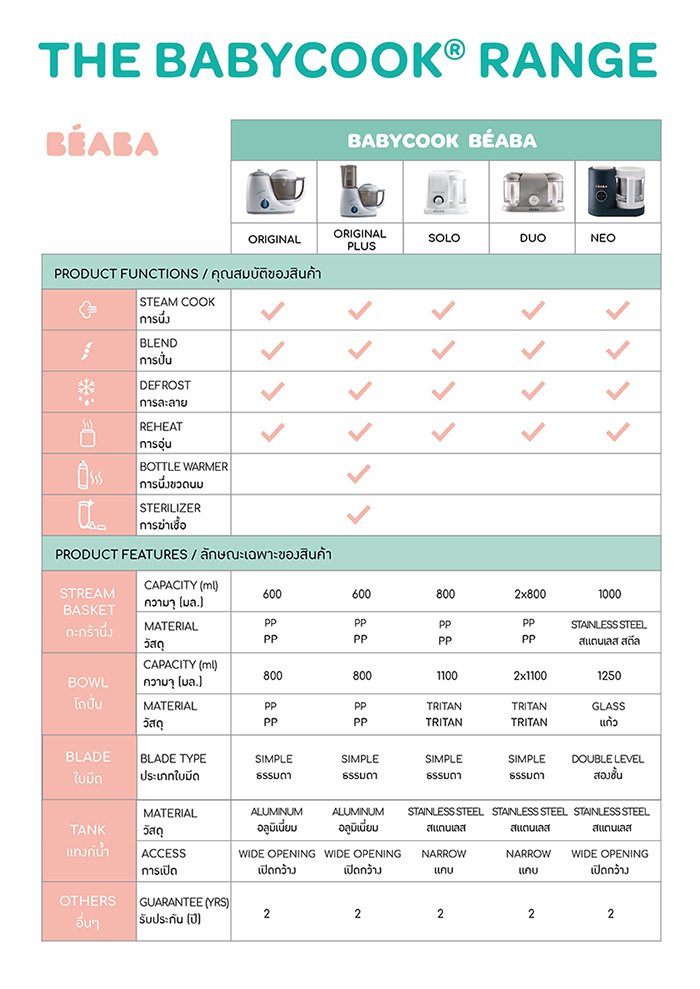 สำหรับ “เครื่องนึ่งปั่นอาหารเด็ก” ของ Beaba มีให้เลือกใช้งานถึง 4 รุ่นด้วยกัน ประกอบไปด้วย Babycook Original, Babaycook Solo, Babycook Duo และ Babycook Neo ซึ่งแต่ละรุ่นได้รับการออกแบบมาพิเศษ เพื่อเป็นตัวช่วยให้คุณแม่สามารถจัดการกับมื้ออาหารแสนอร่อยให้กับลูกน้อยได้อย่างสะดวก รวดเร็ว และยังคงความสะอาด ปลอดภัย อีกด้วย เรามาดูดีกว่าว่า เครื่องนึ่งปั่นอาหารเด็ก Babycook แต่ละรุ่นมีคุณสมบัติและจุดเด่นอย่างไรกันบ้าง